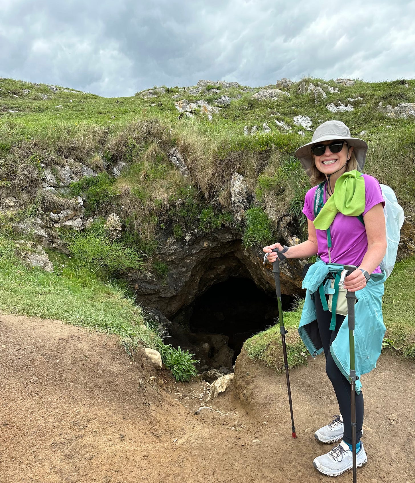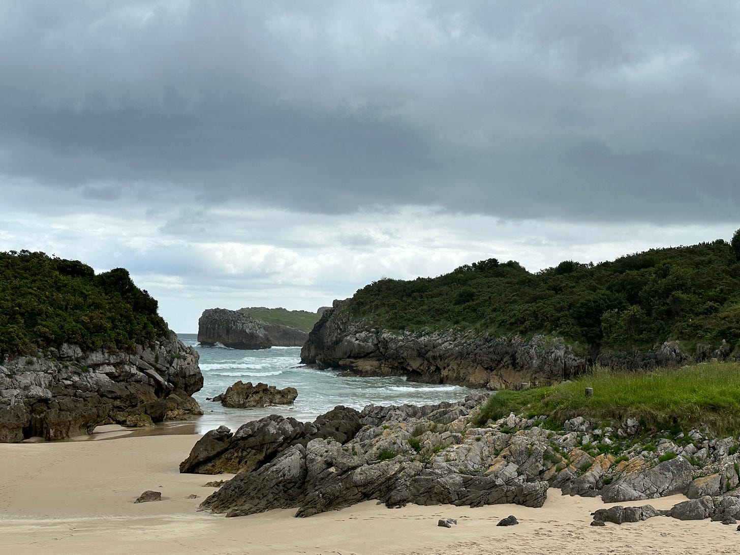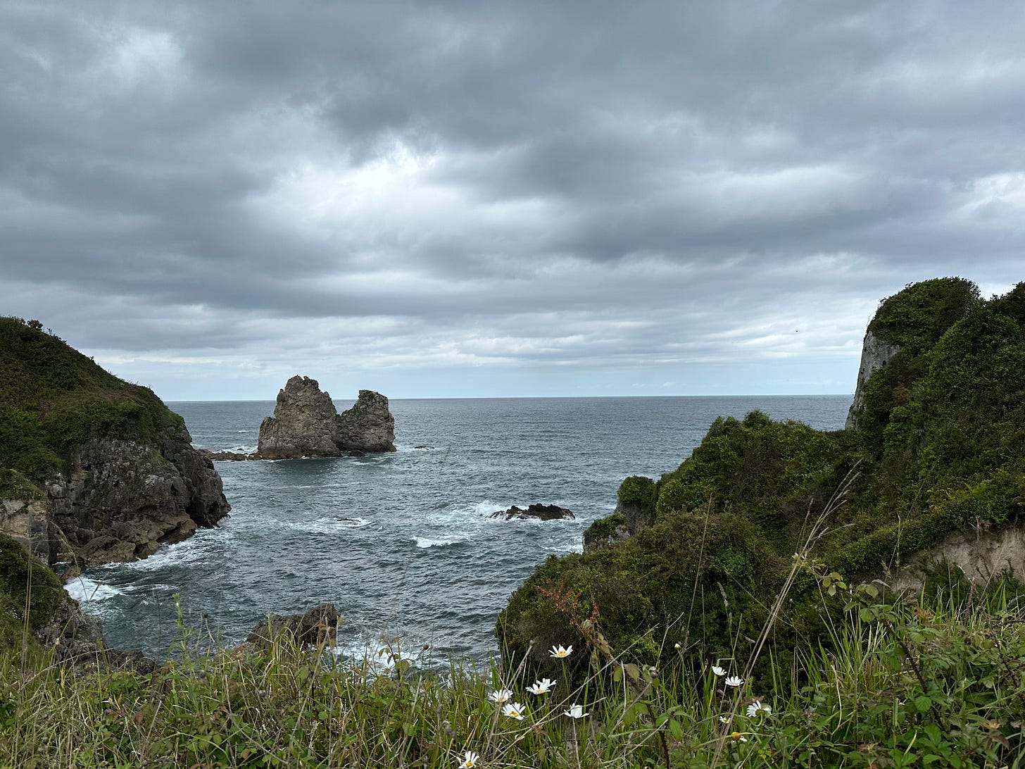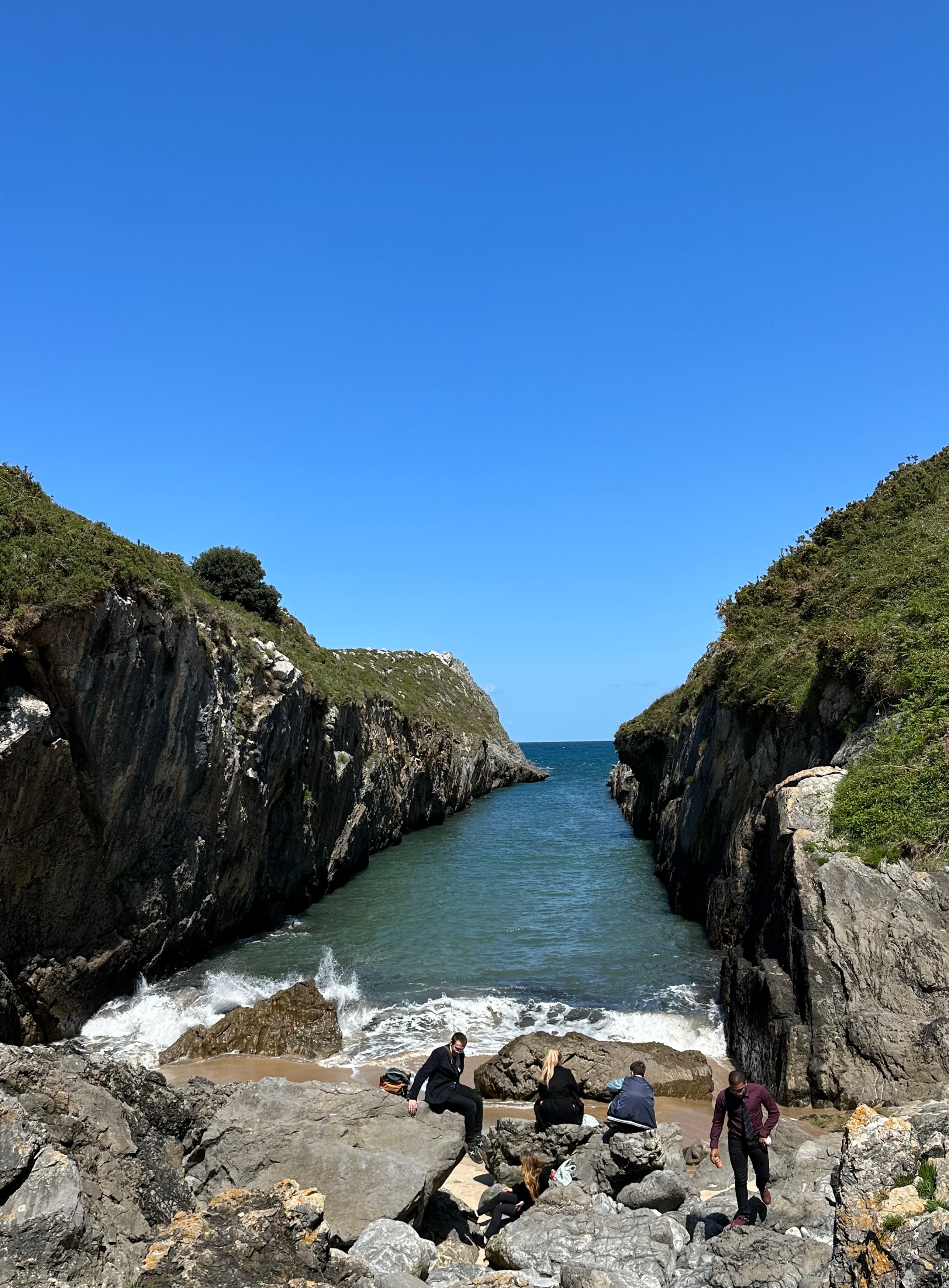 Asturias’s coast line is other-worldly. It’s dotted with “bufones” which are underground, hollowed portions of the coast where the surf pushes through on stormy occasions and sends spray shooting dozens of feet in the air through the small holes. The sea was too calm for us to see this spectacle today but the bufones nevertheless emit eerie, echoey blasts of sound from the surf running beneath the ground. I tried to capture some of these bufones in the pictures, but was too unnerved to get close enough or sufficiently down in them for good shots. There are lots of warnings not to get too close on stormy days because the force of the water through the holes is dangerous and you run the risk of slipping into them.